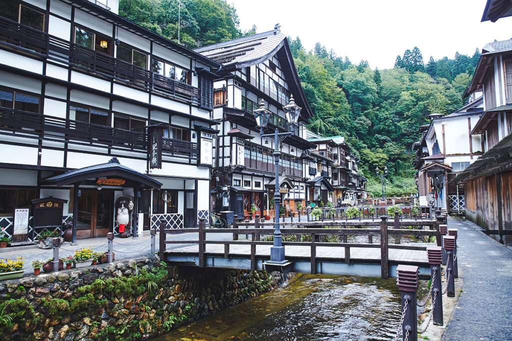位於山形縣山間的 銀山溫泉,是沿著溪流排列著木造旅館的復古溫泉街。